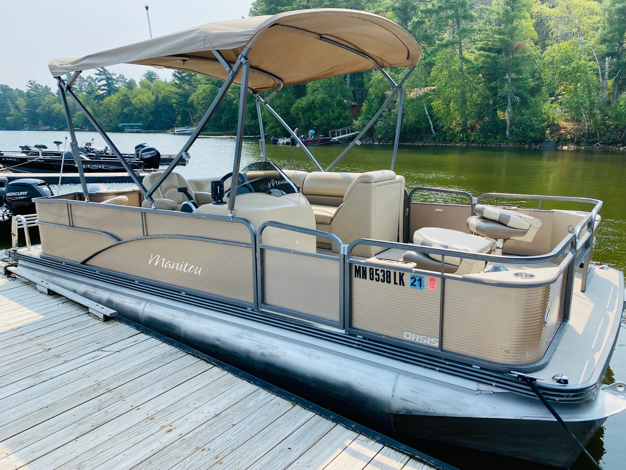 Relax and explore the lake with ease on our spacious pontoons, perfect for family outings, fishing trips, or a leisurely cruise. Each pontoon features console steering, a depth finder, and a live well for anglers. Ideal for soaking up the sun or sharing a picnic on the water. Powered by a quiet and efficient Mercury four-stroke outboards, our pontoons are designed for both relaxation and adventure. Life jackets, an oar, anchor, and tie ropes are included.